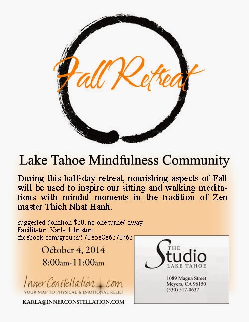 Fall equinox is tomorrow and on this evening's mindfulness walk with cloudy skies and my feather-down vest, I could feel the wheel a turning! Smoke from the King's Fire in Placerville had finally cleared after carpeting our area all afternoon, and I relished in the crisp (almost) autumn air. I'm so looking forward to sharing a nourishing day on October 4th to soak in the aspects of fall. We will be discussing preemptive treatment of Autumn Meridian Points in addition to mindful eating, chants as a vehicle to still and focus the mind, the 5 Mindfulness Training from Thich Nhat Hanh, and my personal favorite, Loving-Kindness Meditation. Please join me in coming together to resource the aspects of the season to nourish ourselves, our loved ones and our community.